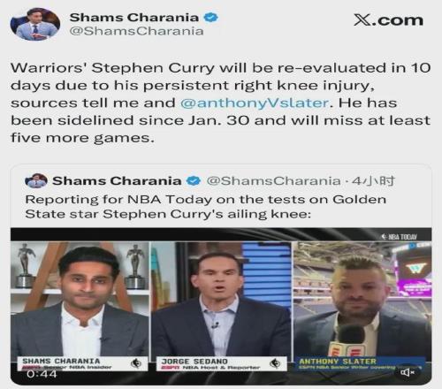 库里十天后才会复诊他的跑步膝,这意味着将至少再缺席5场比赛,而其已休战了17场比赛......