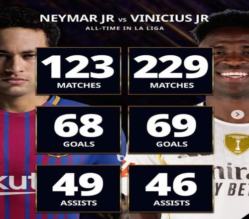 巴西天才西甲数据对比:内马尔123场68球49助,维尼修斯229场69球46助